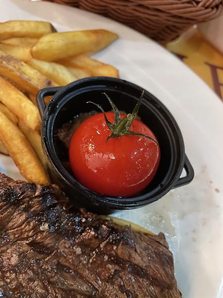 スターターはめずらしくヴィーガンメニューのマッシュルームサラダ、メインはステーキにしました。