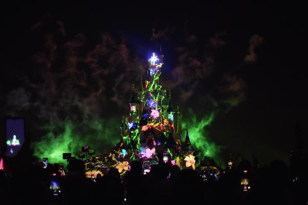 ディズニーの映画のシーンを眠れる森の美女の城をキャンバスに投影していく、舞浜で昔やってた「ワンス・アポン・ア・タイム」みたいなマッピングショーでした。